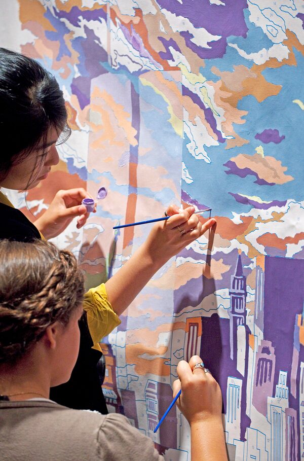 Jessica Huynh, top, and Alana Roecker brush in the colors of a paint-by-number canvas of the original World Trade Center towers, at a news conference, Monday, Sept. 10, 2012 in New York.Mark Lennihan/The Associated Press