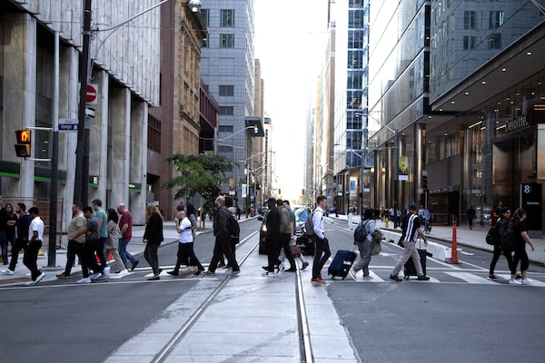 Pedestrians crossing the street in Toronto on May 29.Abhijit Alka Anil/The Globe and Mail