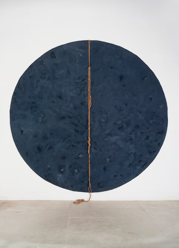 Both the modern.toronto and the MAC display some of the more or less round, unframed canvases Sullivan painted while travelling in Greece and elsewhere in the late 1970s. These include fanciful mythological compositions, as well as elemental textured abstracts, which she painted “as if I were washing a floor,” as she told me in a conversation last year.