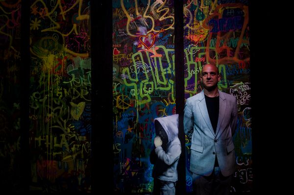 Lazarides poses for a portrait in front Banksy’s Forgive Us Our Trespassing in Toronto on Tuesday, June 12, 2018.Christopher Katsarov/The Globe and Mail