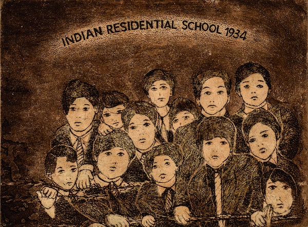 Obomsawin’s Indian Residential School 1934 looks like a class photo, but the children seem to be holding onto a rope or wire that pens them in.