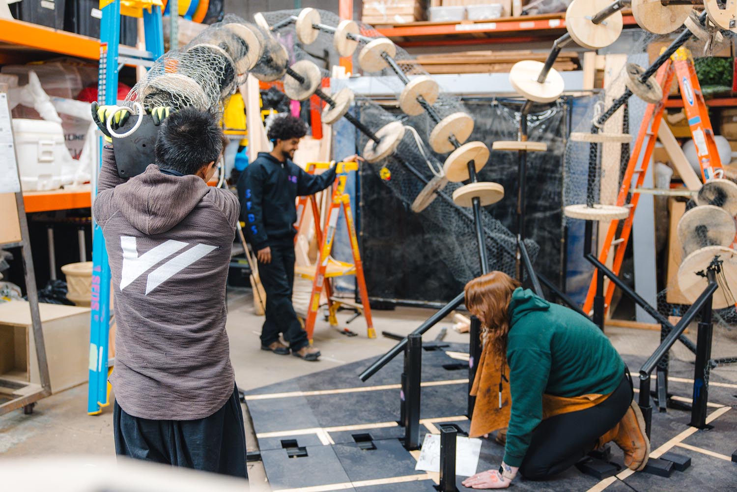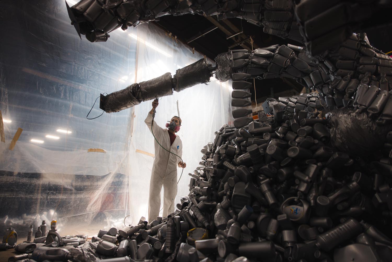 Items were organized by size, type and crushability. Around 1,000 flattened containers were used to create the spiral pattern on the installation’s necks. Holes were drilled into each one, which were then strung together with fishing line. The crew built a number of makeshift gadgets to crush the plastic with a stomp or heavy step.