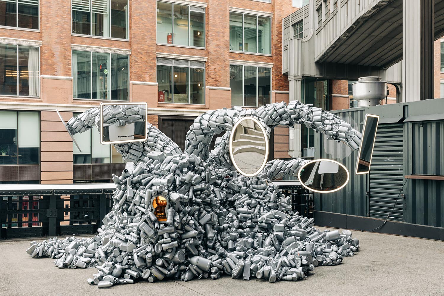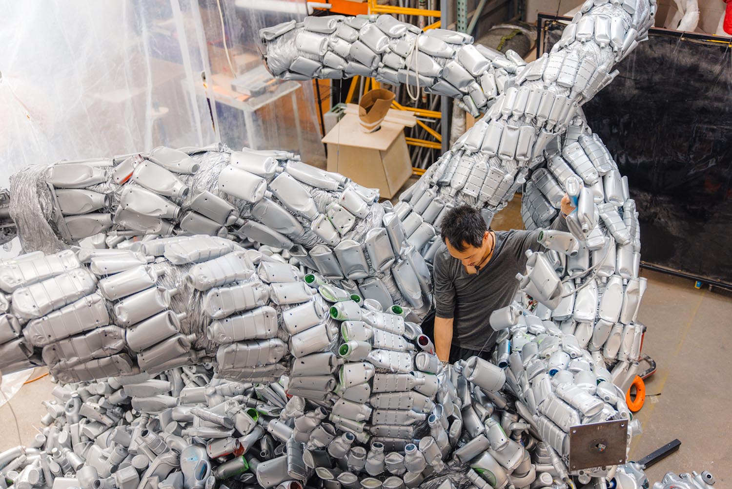 On the elevated High Line park in New York’s Meatpacking District, an older couple lingers around a hulking silver beast with five necks jutting out of its core. The man stands back and takes a photo. A young woman crouches and peers into an illuminated opening shaped like an oversized keyhole, then sticks her phone inside. A trio of tourists slowly walk around the creature, which has scale-like skin made from thousands of used plastic containers. They spot its creator, and ask to take a picture of him with his work.