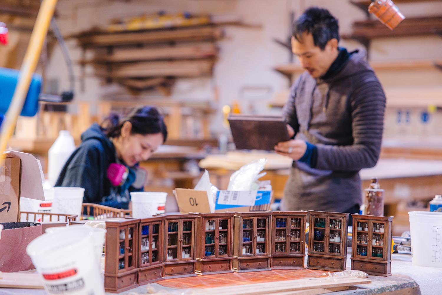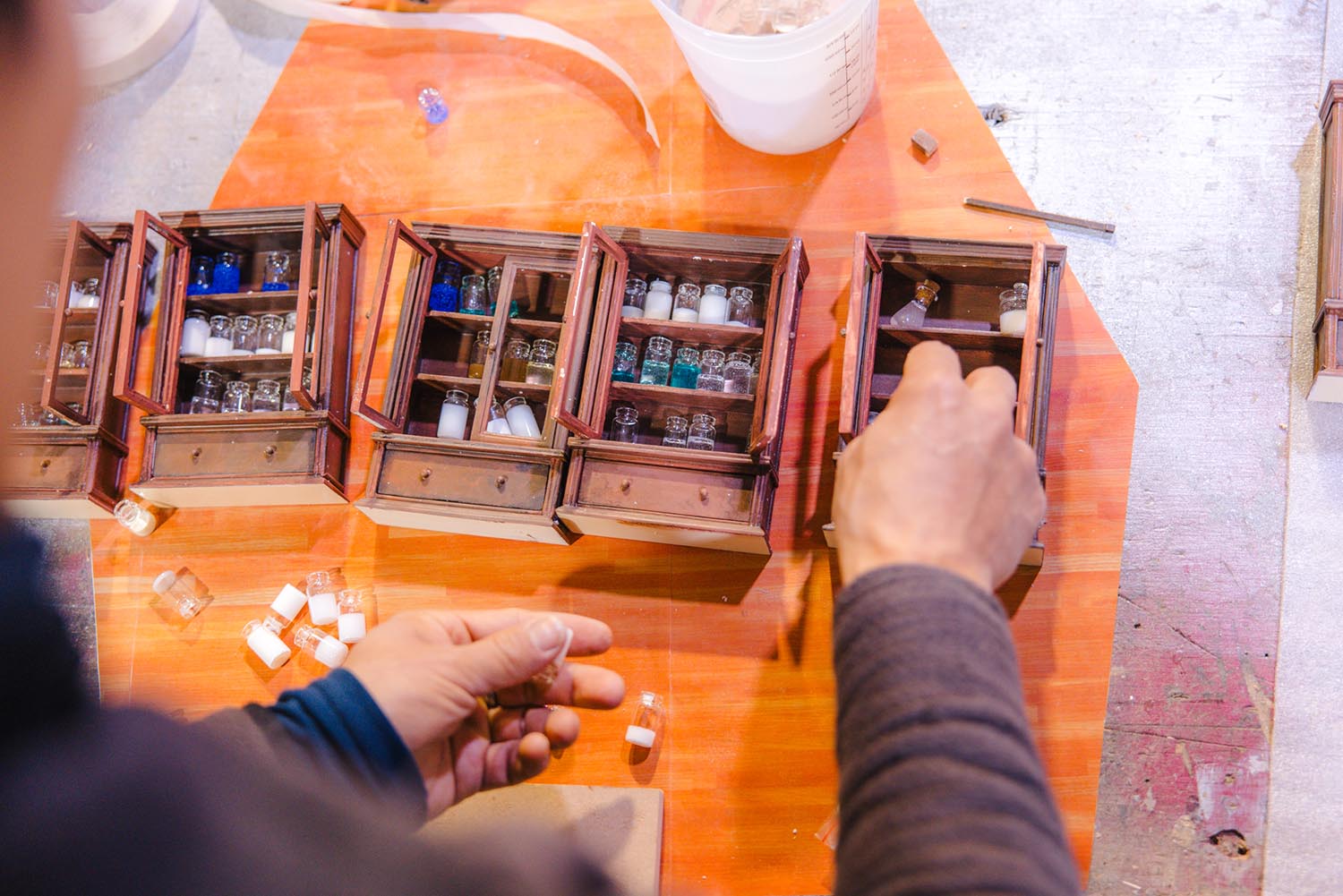 Von Wong designed a diorama, on view inside the installation, of a 1850s-style apothecary with tiny glass bottles. Von Wong says the scene is a reminder of a time ‘before we were all addicted to plastics.’ It is filled with dollhouse furniture painted and decorated by SFDS scenic artists.