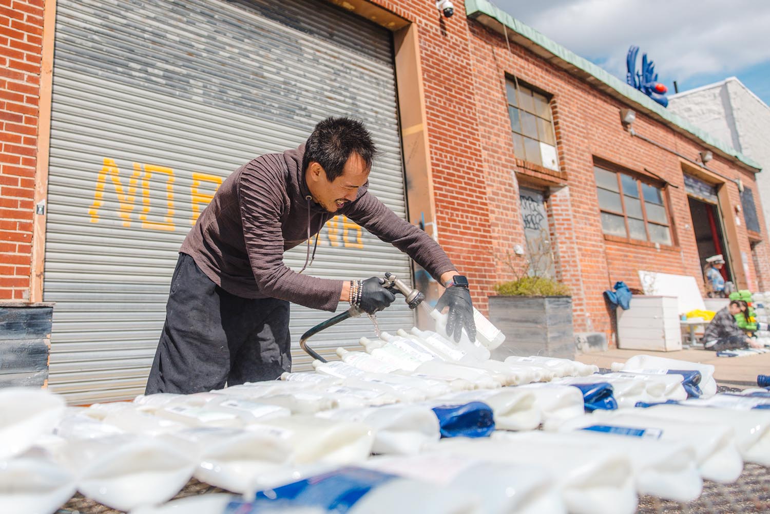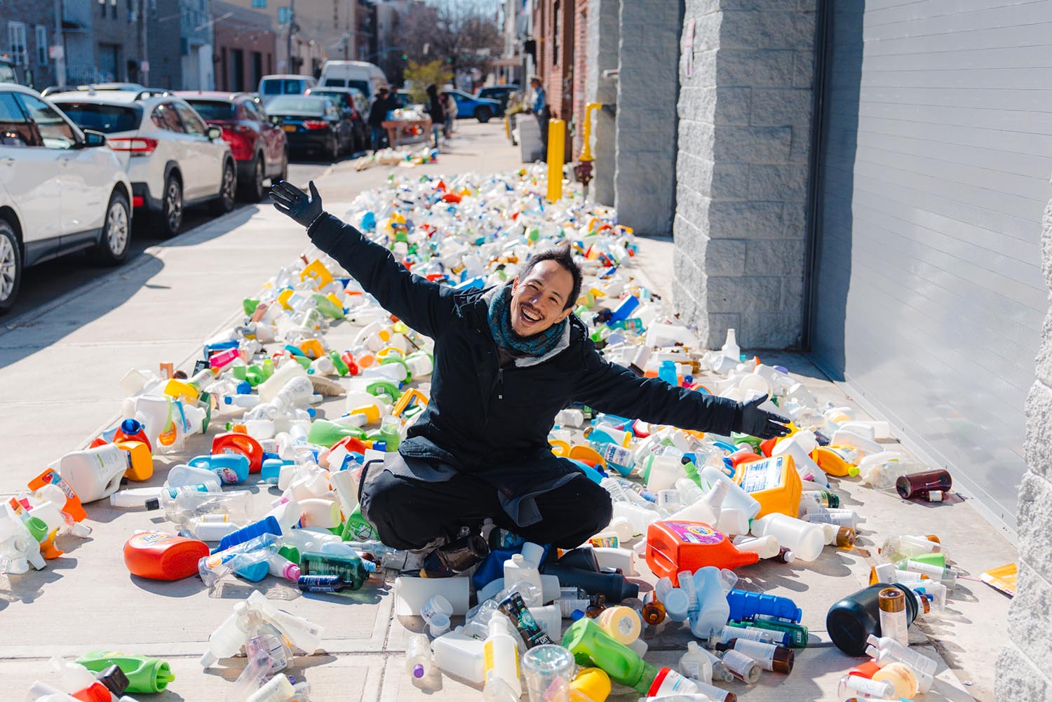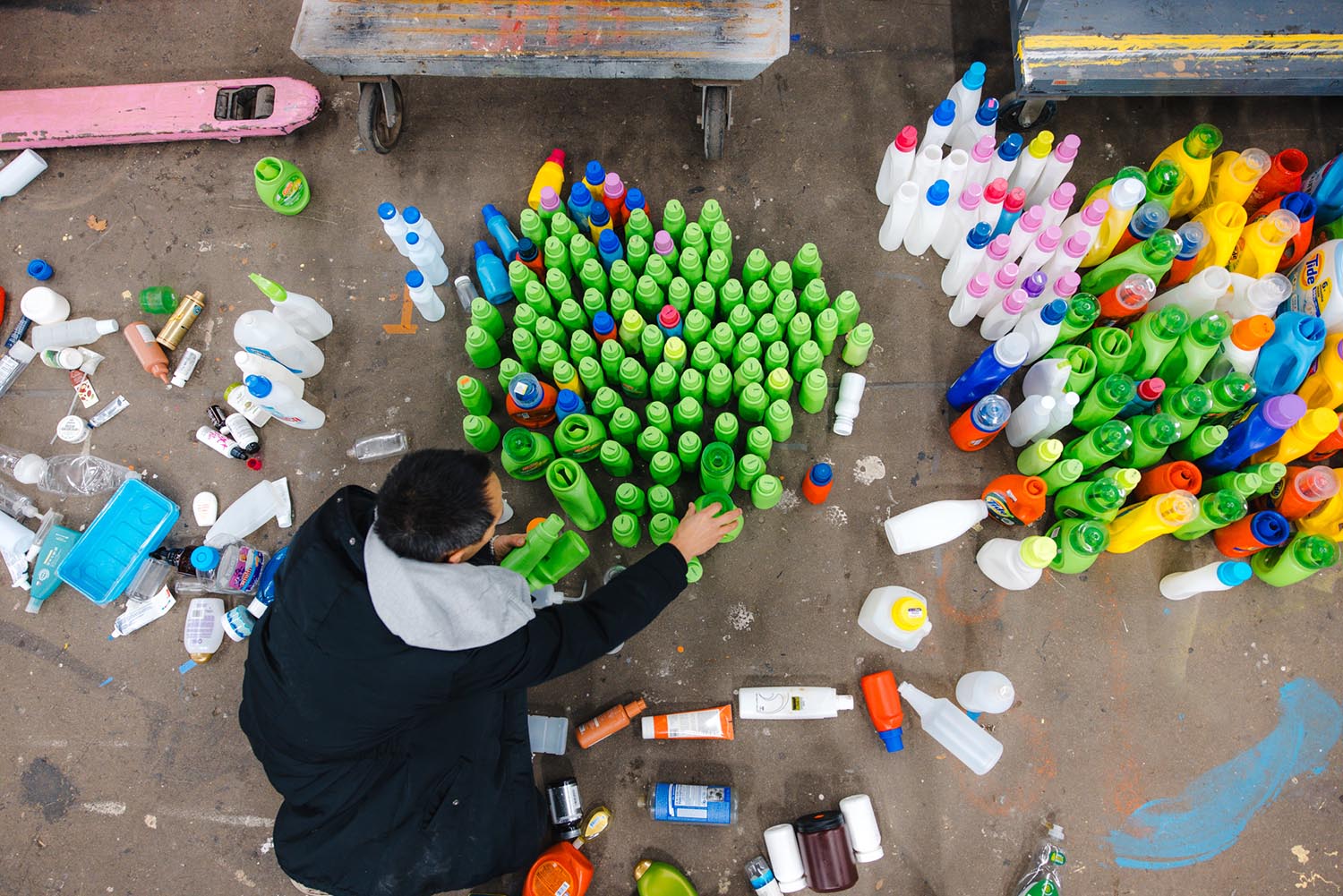 Benjamin Von Wong and a crew of volunteers sorted through nearly three tonnes of plastic collected by the Sustainable Fashion Community Center in Manhattan, which let people swap a cleaned container for one piece of donated clothing. The approximately 100 volunteers included high-school students, art enthusiasts, retirees, florists and photographers.