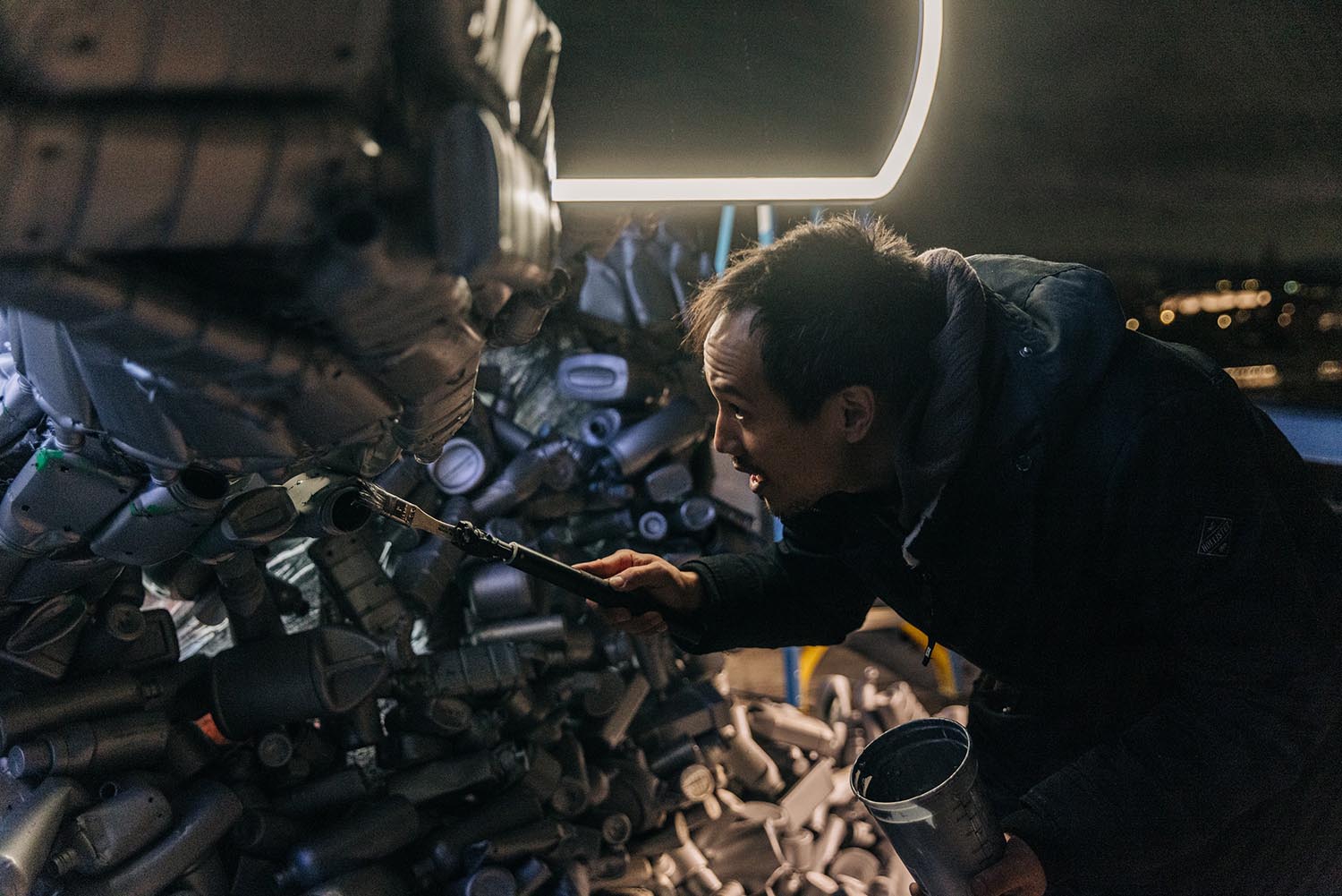 During transportation, some parts were scuffed or broken. Von Wong and an artist from SFDS spent around an hour and a half painting touch-ups, repairing snapped strings and adding bottles to fill gaps. ‘Around 2 or 3 a.m. I was looking for some specific kind of plastic and it turned out someone had forgot to pack it,’ Wong says. ‘Someone had to drive back and get them.’ Around 6 a.m., the installation was finished.