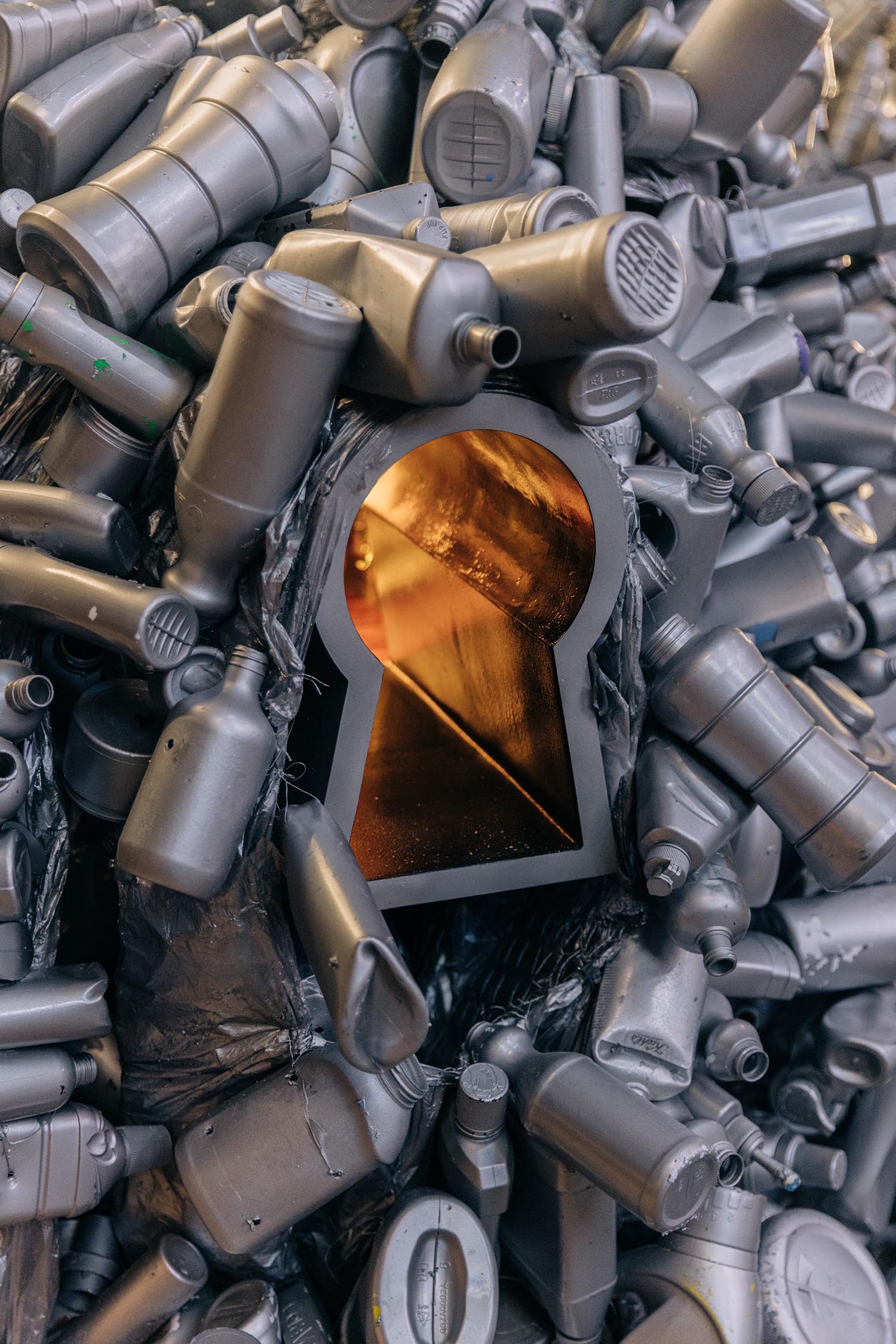 To combat this feeling of climate anxiety, he’s taking a decidedly optimistic viewpoint through his work. That’s why a glowing keyhole in the belly of the Single-Use Reflections leads to a miniature, old-timey apothecary with shelves of bottles meant to remind people that household product containers can be reused.