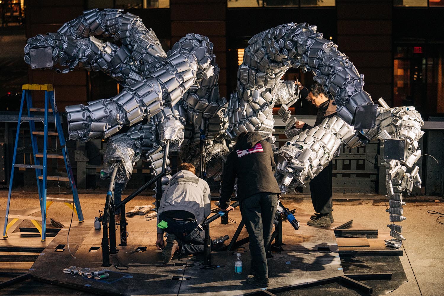 The installation process began around 8 p.m. on April 4. Each section was wrapped in blankets and transported from Brooklyn in a flatbed truck. At the High Line, Von Wong and the installation crew carried the pieces two blocks from a freight elevator to the site, located above the Chelsea Market. The heaviest necks weighed around 32 kilograms each, with the longest one stretching 3.6 metres.