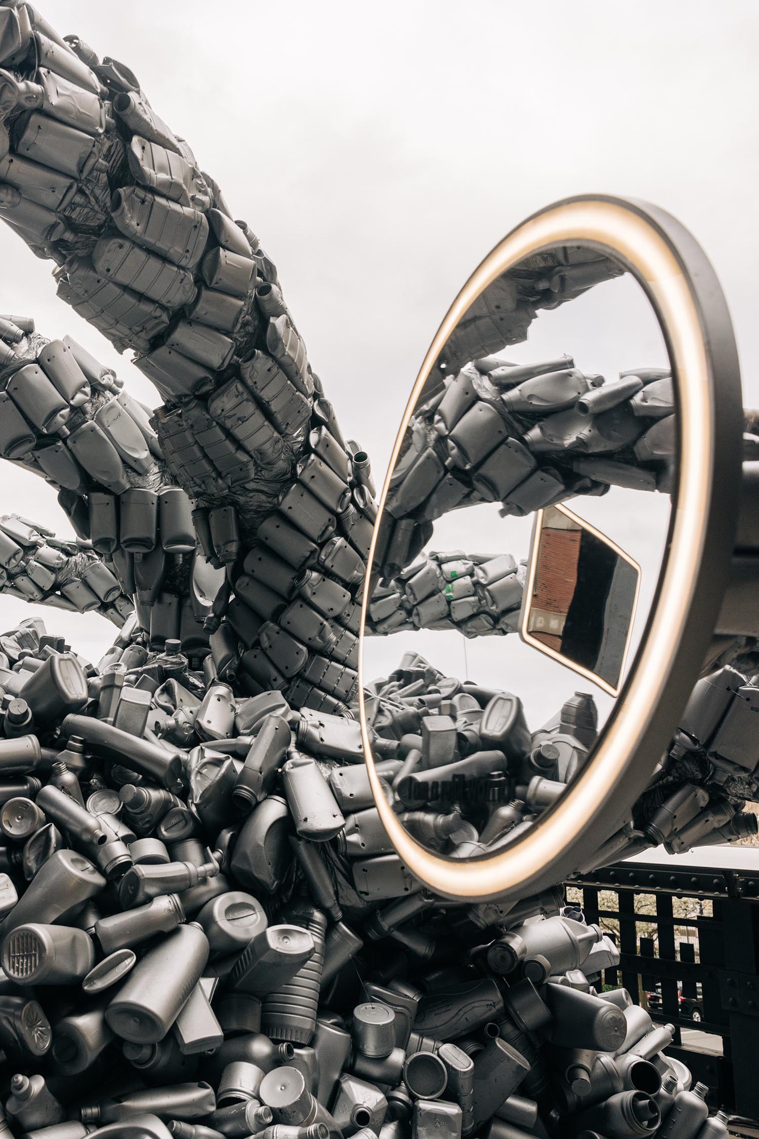 With the help of more than 100 volunteers, Von Wong and his crew organized tens of thousands of containers by size, shape and crushability. The plastic pieces – some flattened, others left intact – were tied together with fishing line to form nearly two-metre-long strings and then spray-painted silver. The strings were then wrapped around each neck, which were covered with chicken wire and recycled pallet wrap. A mirror attached to the end of each neck acts as a monster’s head, encouraging the viewer to reflect on their own role in plastic overconsumption – or to take a selfie.