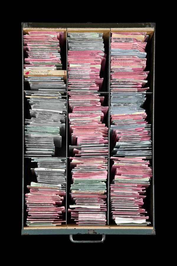 It’s these art history slides – and the canon of Western art that they represented – that Dobson takes as her subject. Relying on discarded collections from both Guelph and Ryerson University, she has created a series of large-scale inkjet prints from digital photographs of the slides themselves, mounted in round carousels or tucked away in pink and blue paper sleeves in big metal drawers, each one carefully labelled. These new photographs, rigorous yet gorgeous, are highly formal, reducing the apparatus of the slide library to an evocative geometry. Photographed from above, the carousels appear as sacred mandala; a stack of them seen from the side becomes an ancient tower.