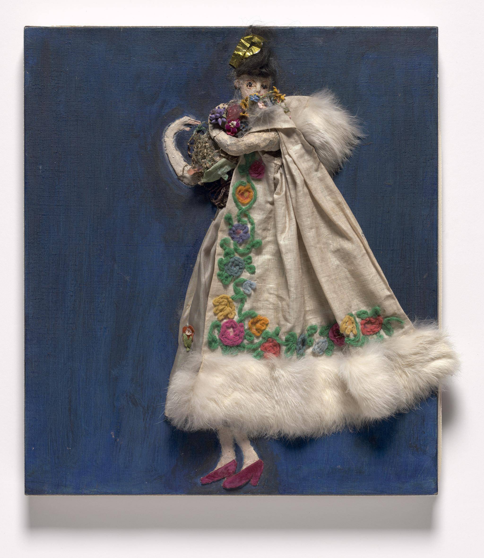One side of a curved wall in the gallery features a projection of archival footage filmed during the dress rehearsal of Virgil Thomson's groundbreaking all-black opera Four Saints in Three Acts. Staged on Broadway in 1934 and choreographed by Frederick Ashton with a libretto by Gertrude Stein, the costumes are by Stettheimer. In the populous tableaux nearby, Stettheimer's distinctively androgynous, sylphlike figures are languid and slinky, as though clay melting into liquid. Many paintings, such as Spring Sale at Bendel's, have an almost theatrical use of space and play with the idea of performance, with the canvas a stage set that hosts overlapping narratives and monologues. On the other side of that wall, character designs are arranged in a joyous procession. Stettheimer was so inspired in 1912 after seeing Nijinsky perform that she created these elaborate concepts for an unproduced ballet called Orphée of the Quat-z-Arts. Figure of a Woman, for example, is dimensional with fabric, hair, fur and yarn. The procession relates to the Stettheimer self-portrait with a painter's palette and a faun that is the first painting that exhibition visitors see. It is undated but marks the moment after she saw Nijinsky and arguably solidified her creative vision. Other maquettes in the series inspired by his Afternoon of a Faun include bits of tulle, modelling putty, fine beaded chain and cellophane, the transparent synthetic film she used in both her art and studio decor that became something of a signature.