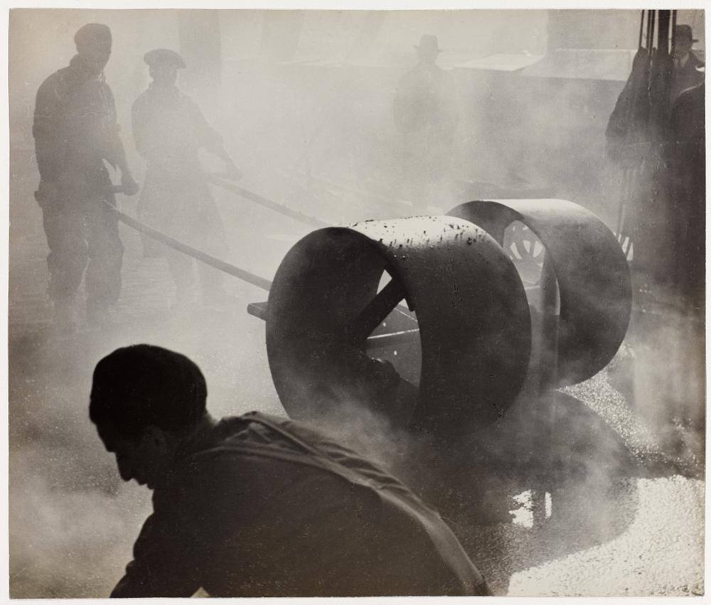 Harry Malcolmson: A very, very unconventional Kertész. His heartland was observation, sophisticated documentation, a realization of the world as it rather literally is. This work isn’t so much a documentation as a representation of an idea of the character of an activity. It’s presented in a non-literal way, a kind of ethereal, moody presentation.… It’s very painterly in that the silhouetted figure in the foreground seems almost designed as a means to present the depth of the work. Also uncharacteristic is that none of the figures have any personal individuality. There have no features and the emphasis is not on any human being but rather on the asphalt drums. What we’ve found among people who really know their Kertész is they either like it or don’t like it. We’ve had estimates of its value and of the entire collection, it’s the one photograph where the variation in monetary terms has been unbelievably variable.
