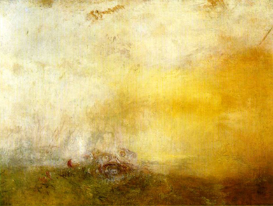 The painting (which usually resides at the Tate in London) is unusual for Turner in that it is fantastical: It is a blurry yellowy-brown seascape with a vague, threatening, monstrous shape looming in its centre. The central form could be made up of two fish, but together they seem to form the sketch of a face with large eyes. Nothing in this scene – neither sea nor sky nor animal – has a clear outline. It is almost abstract and so an exemplar of Turner's daring formlessness.