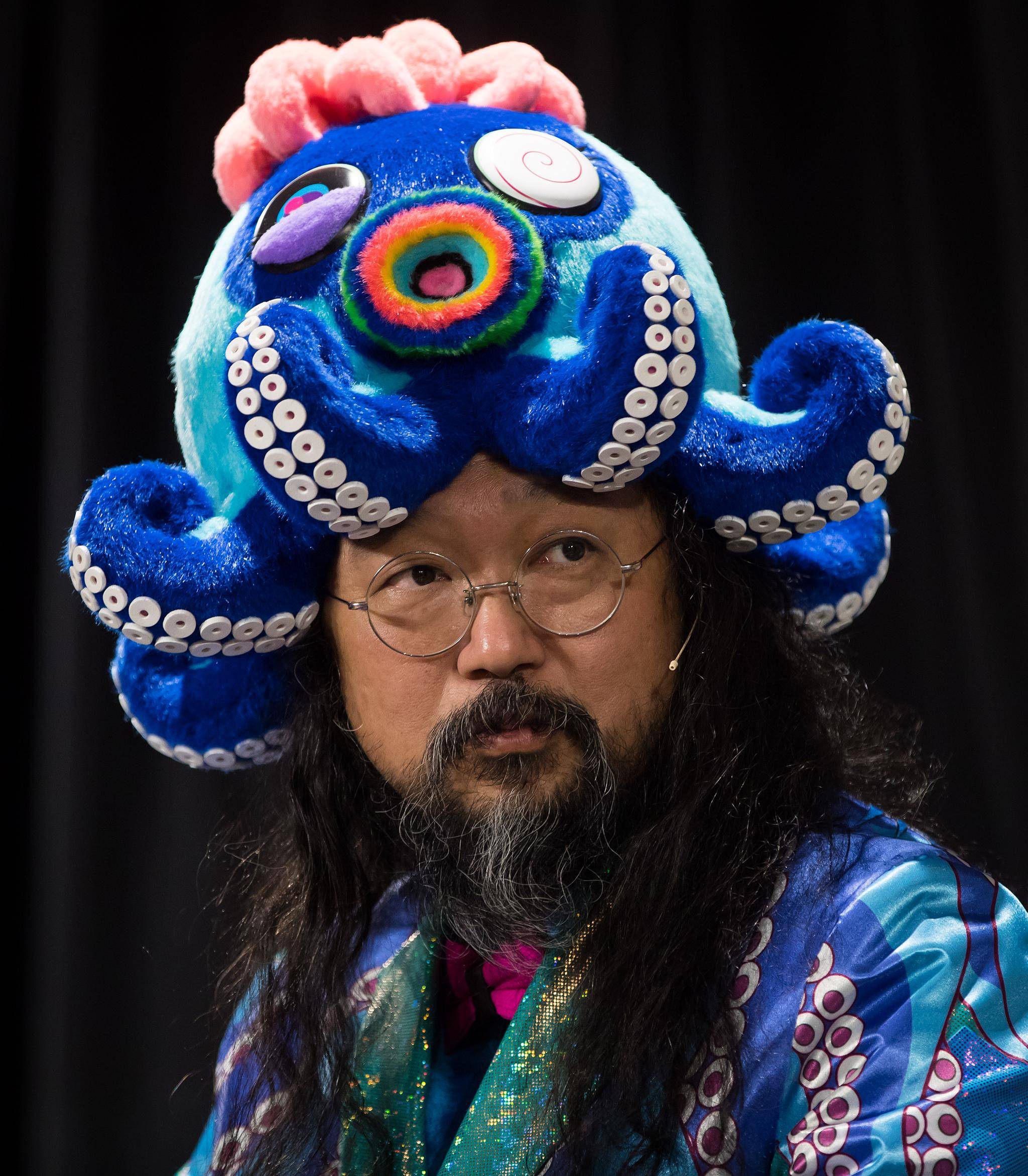 He is with a translator (whose services he mostly chooses not to use; he prefers to answer the questions himself in English) and wearing a get-up of his own design: white Nike Air Jordans (a birthday gift from DJ/designer Virgil Abloh, according to Mr. Murakami's Instagram), turquoise tights, pink bow tie and baggy octopus-inspired shorts, blazer and most prominently, novelty-sized hat, its tentacles curling up to frame his face. It's warm inside and we're not taking photos, so I suggest he remove some of the costume so that he can be more comfortable.