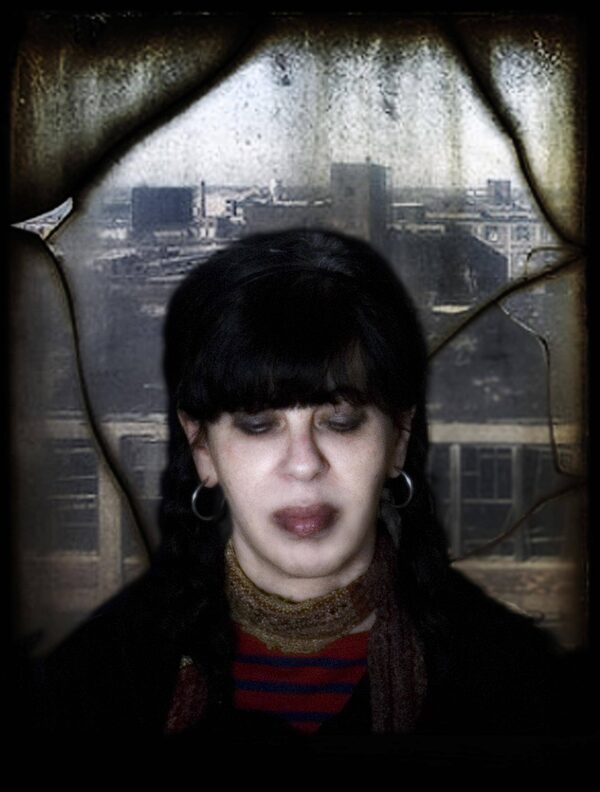 A self portrait by Elizabeth Fischer. Fischer is an artist, musician and writer, known for her paintings and drawings, and for her work with the bands Animal Slaves and DarkBlueWorld.Elizabeth Fischer