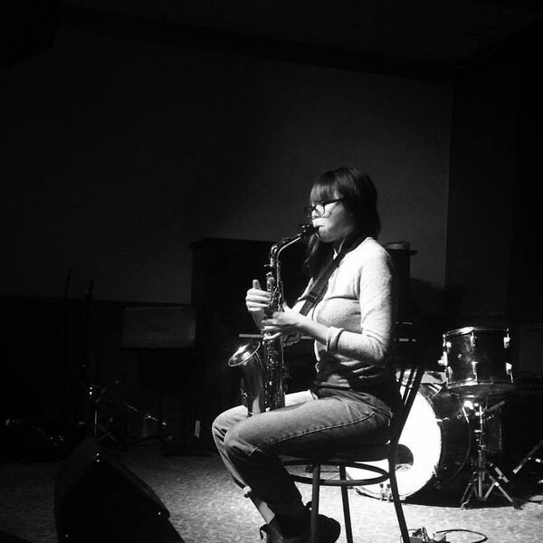 She hunches into a few impromptu minutes with her alto, serving up improvised allsorts, fragmented jazz lines changing to chiming tones, then to puffs of reed-popping noise. Josh Cole, bent over his double bass, accompanies her up the fingerboard, adding a patter of bass droplets.