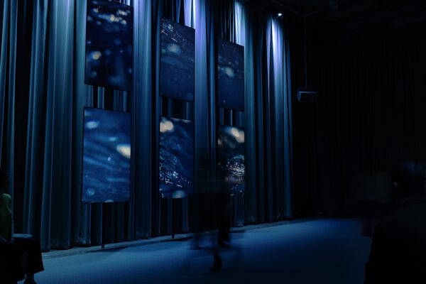 Film clips of the Matthew Herbert song Café de Flore magically bridging timelines in the 2011 movie of that same name and Jake Gyllenhaal’s character wearing headphones and dancing to Mr. Big by Free in 2015’s Demolition are seen on screens scattered on the walls.