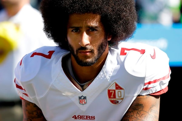 In this Sept. 25, 2016, file photo, San Francisco 49ers quarterback Colin Kaepernick kneels during the national anthem before an NFL game against the Seattle Seahawks in Seattle. Kaepernick was a second-round draft pick in 2011 who the next year led the San Francisco 49ers to the Super Bowl. By 2016, he had begun kneeling on the sideline at games during the national anthem to protest social injustice and police brutality. Soon after, he was gone from the NFL, and he has not played since.The Associated Press