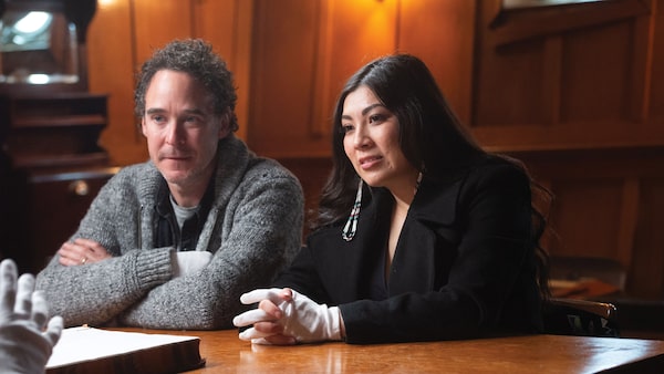 Erin Goodpipe, right, and Saxon de Cocq appear in the premier episode of the series Treaty Road on APTN, which explores the complex and often shocking histories behind treaties signed by Indigenous peoples and the British Crown between 1871 and 1921.Supplied
