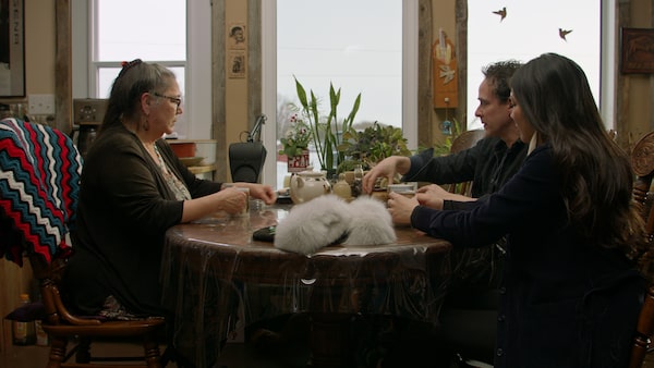 Each episode looks at the circumstances of a treaty, and charts its present-day effects on land, resource extraction, food sovereignty and justice. Episode three, about water, is arguably the most wrenching. The hosts meet activist Judy Da Silva, who’s been part of the Grassy Narrows anti-clear-cutting blockade since 2002, and who suffers the effects of mercury poisoning that began in 1962 when pulp mills dumped 9,000 kilograms of mercury into the lakes and rivers of Treaty Three territory, contaminating the water and its fish for hundreds of years. Goodpipe, who is pregnant in the episode, normally keeps a straight face – “I’m not a crier,” she says – but we see her trembling here.