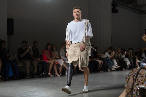 A Ukrainian war veteran walks the runway wearing an outfit by designers Andreas Moskin and Andriy Bilous during a Fashion Week show in Kyiv, on Sept. 3.Efrem Lukatsky/The Associated Press