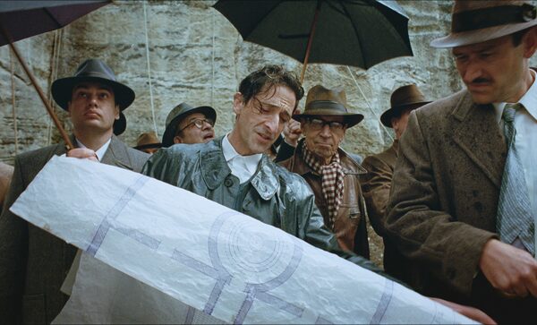 This image released by A24 shows Adrien Brody, centre, in a scene from The Brutalist.Lol Crawley/The Associated Press