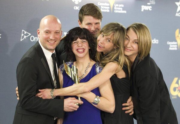 Actress Gabrielle Marion-Rivard, middle, joins Luc Dery, Kim McGraw, Louise Archambault and Alexandre Landry with their film Gabrielle’s award at the Canadian Screen Awards in Toronto on March 9, 2014. Gabrielle is a coming-of-age romance abou a woman in Montreal who has Williams syndrome, a rare developmental disorder.FRED THORNHILL/The Canadian Press