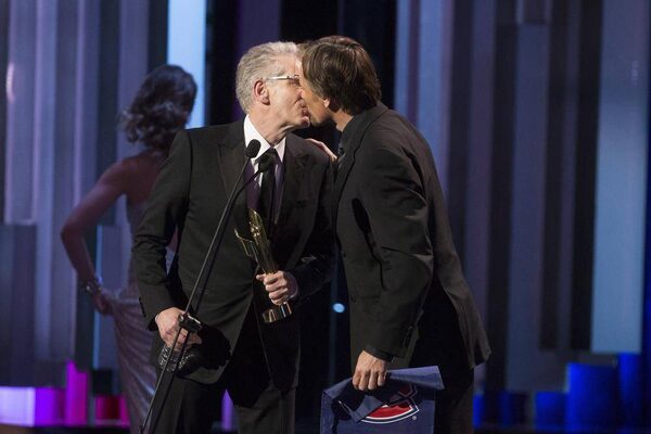 Director David Cronenberg, right, holds his Lifetime Achievement Award beside actor Viggo Mortensen holding a Montreal Canadiens flag, at the 2014 Canadian Screen Awards in Toronto on March 9, 2014.MARK BLINCH/Reuters