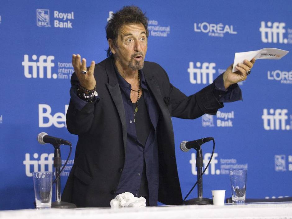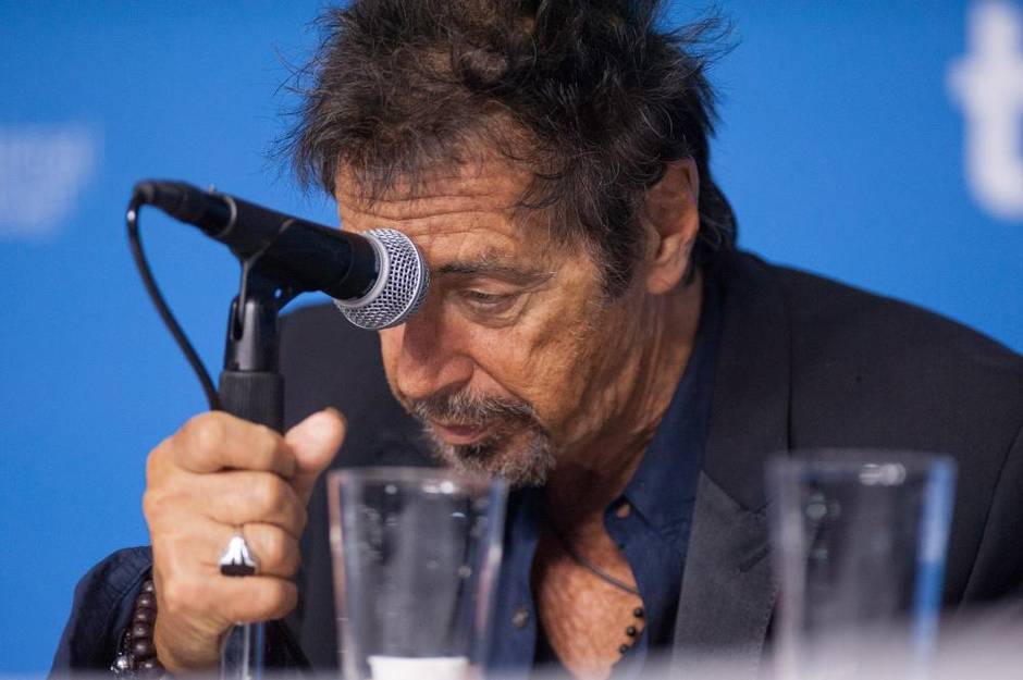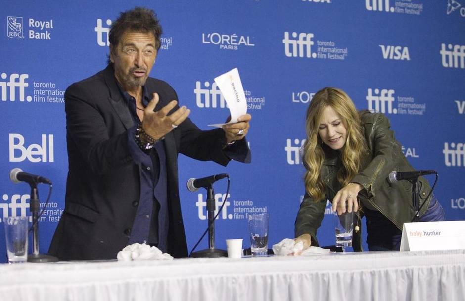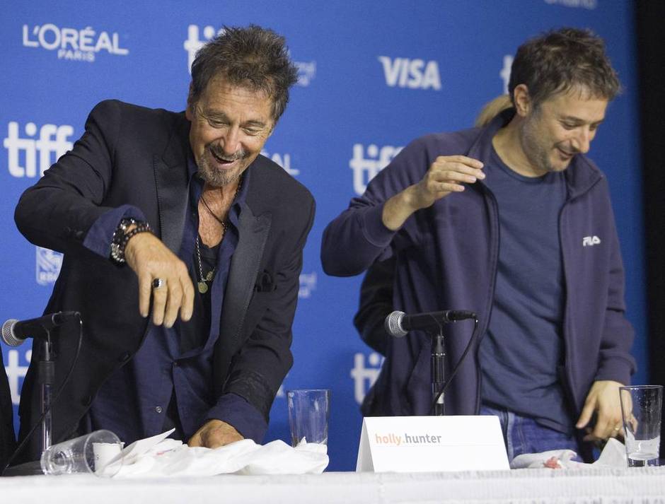 Al Pacino struggles with his water glass at the Manglehorn press conference.