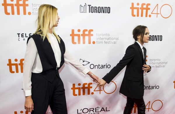 Actress Ellen Page, right, and her partner Samantha Thomas pose for photographs on the red carpet for the new movie 'Freeheld ' during the 2015 Toronto International Film Festival, in Toronto, on Sunday, September 13, 2015.Nathan Denette/The Canadian Press