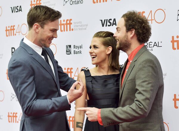 Actors Nicholas Hoult, left, and Kristen Stewart, centre, laugh with director Drake Doremus, right, while posing for photographs on the red carpet for the new movie 'Equals' during the 2015 Toronto International Film Festival in Toronto on Sunday, September 13, 2015.Nathan Denette/The Canadian Press
