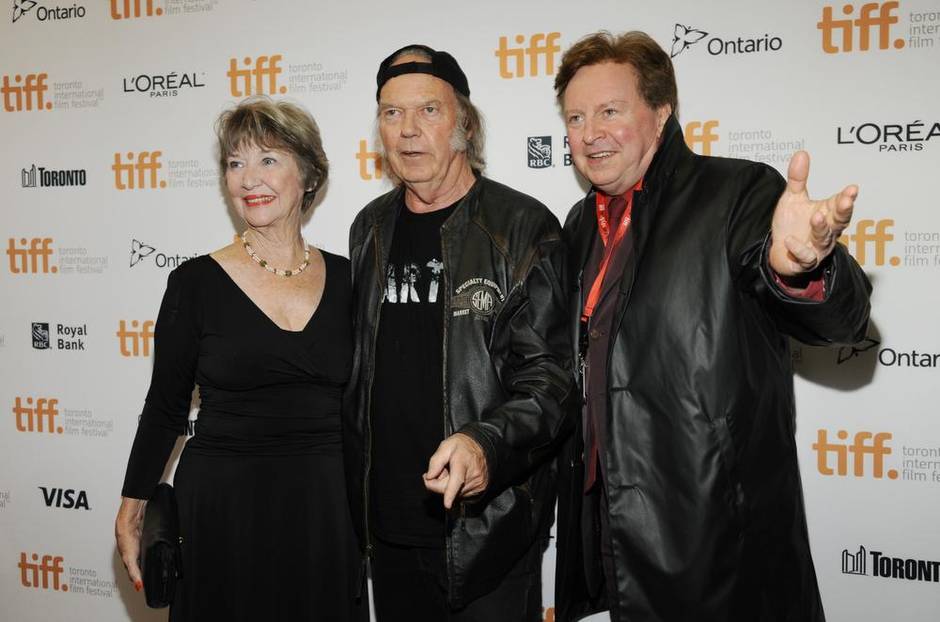Neil Young poses with cast members Charlotte Stewart, left, and Gerald Casale at the premiere of the director's cut of the ‘Human Highway.’