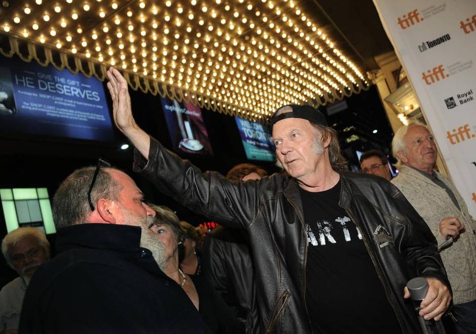 Musician Neil Young, star and co-director of the 1982 film ‘Human Highway,’ waves at fans as he arrives at the premiere of the director's cut of the film.