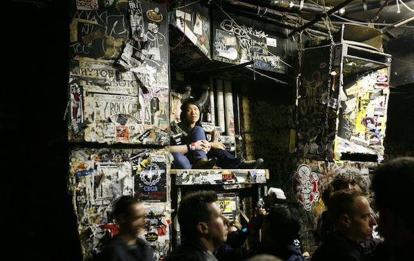 A pair of patrons (C) sit on top of a sticker covered speaker inside the music venue CBGB in New York City October 14, 2006. CBGB is closing on October 15 after 33 years as a music venue.LUCAS JACKSON/Reuters