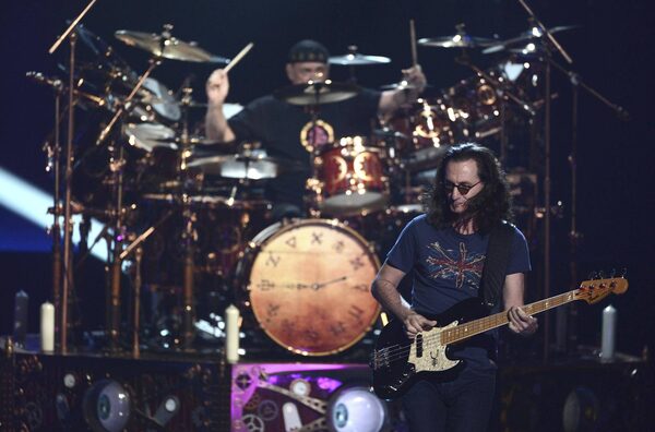Musicians Neil Peart and Geddy Lee of Rush perform on stage at the 28th Annual Rock and Roll Hall of Fame Induction Ceremony April 18, 2013.Kevin Winter/Getty Images