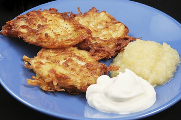 Potato latkes served with sour cream and applesauce.iStockphoto/Getty Images/iStockphoto