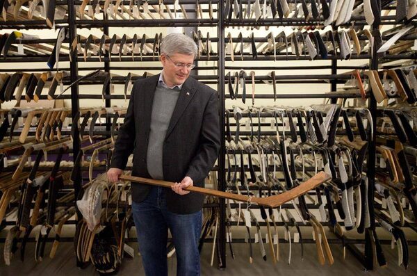 Stephen Harper holds a hockey stick from the 1907 Stanley Cup final during a research visit to the Hockey Hall of Fame in Toronto, Canada, December 2011.Simon and Schuster Canada