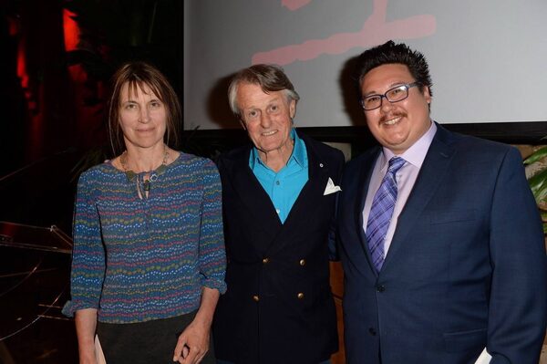 Scott Griffin, centre, poses with the international Griffin Poetry Prize winner Alice Oswald, left, and Canadian winner Jordan Abel following the gala night in Toronto on Thursday, June 8, 2017.Tom Sandler