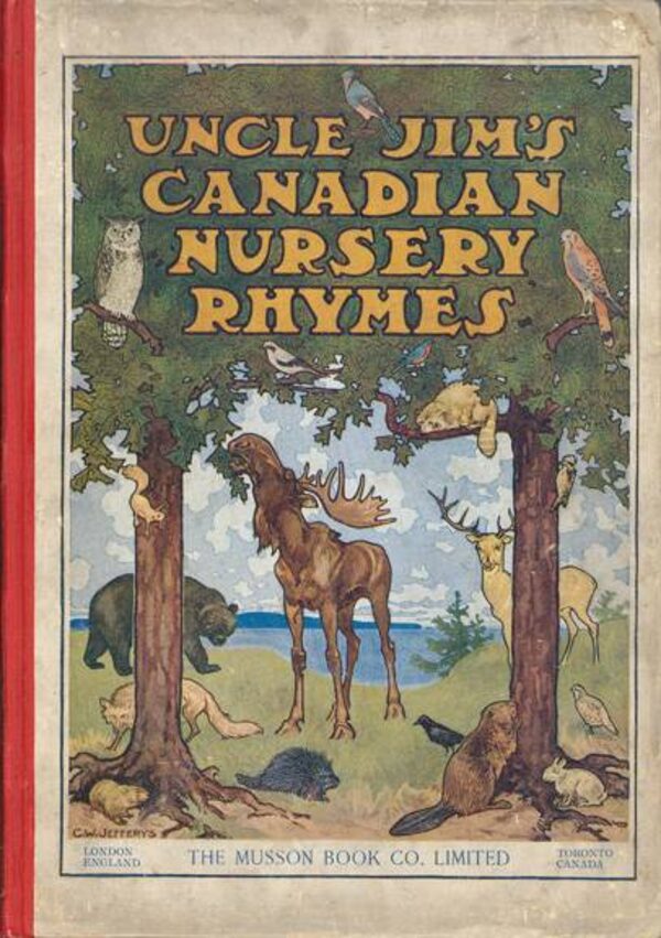 The cover of "Uncle Jim's Canadian Nursery Rhymes: For Family and Kindergarten Use". Illustrated by C.W. Jefferys. London and Toronto: Musson, 1908