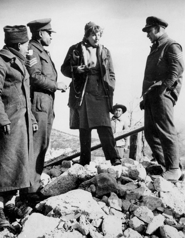 American writer and war correspondent Martha Gellhorn, center, talks to Native American soldiers on the 5th Army on the Cassino Front in Italy, March 1944 during World War II.The Associated Press