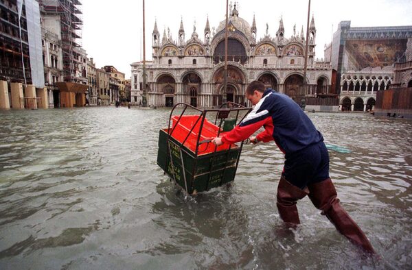 A worker tries to wheel his cart through a flooded St. Mark's Square during high tide in Venice in November, 1997. Despite 10 years of preparations and rapidly rising waters, government advisers were expected to give the thumbs down to a $2.5 billion dam project code named 'Moses,' which is intended to save Venice, for environmental and cost reasons.Reuters