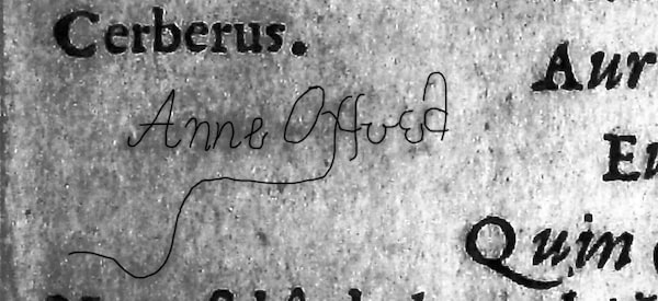 A pair of images showing the signature of 'Anne Oxford' who would be Anne de Vere (née Cecil), Countess of Oxford and wife of the 17th Earl of Oxford, Edward de Vere. Here she writes her name next to a piece of Horace's Odes 2.13 that she quotes in her own 1583 sonnet on her dead baby.Supplied