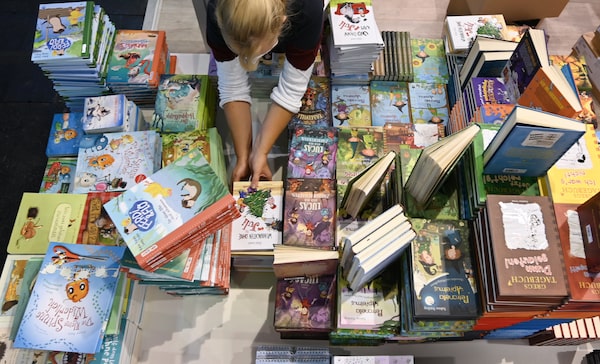 An employee sets up the Bastei Lübbe stand at the Frankfurt Book Fair on Oct. 19.picture alliance/AFP/Getty Images