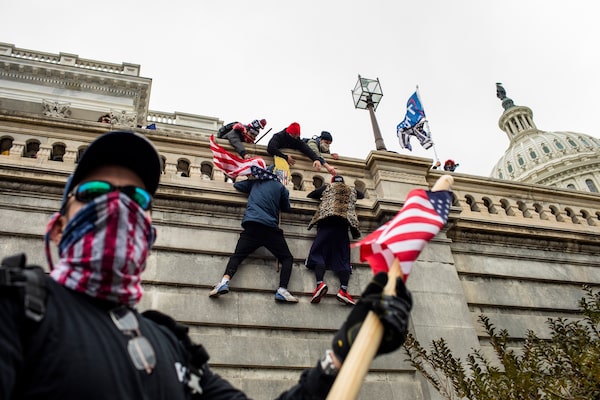 Protestors scale a wall of the U.S. Capitol in Washington on Jan. 6, 2021.JASON ANDREW/The New York Times News Service