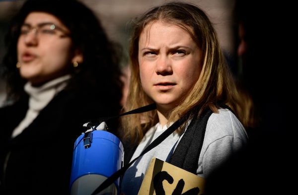 Swedish climate activist Greta Thunberg takes part in a school strike for climate and social justice march in Stockholm on March 25.PAUL WENNERHOLM/AFP/Getty Images