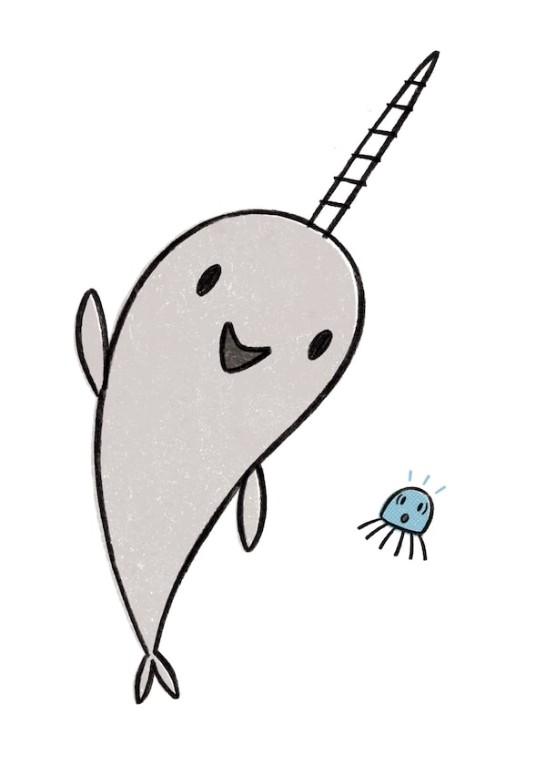 Soon after, he was standing in line for ice cream when Narwhal’s personality came to him. “I was getting a waffle cone,” he says. “And I was connecting the cone with the giant tooth/tusk Narwhal has, and all of a sudden it occurred to me, ‘What if this character was just as sweet and awesome and fun and different like a waffle cone and ice cream? What if this character was as excited about his day as I am when I’m about to share a scoop with a friend?’” That night, he came up with three Narwhal stories. The next day, he had four more story ideas. And then up popped Jelly. “You think of jellyfish as very squishy,” Mr. Clanton continues. “They’re made of 95 per cent water. They’re a gelatinous sort of creature, so you think of them having a squishy sort of personality to match. And I thought it would be funny if he had an exacting sort of personality to play against his formlessness.”