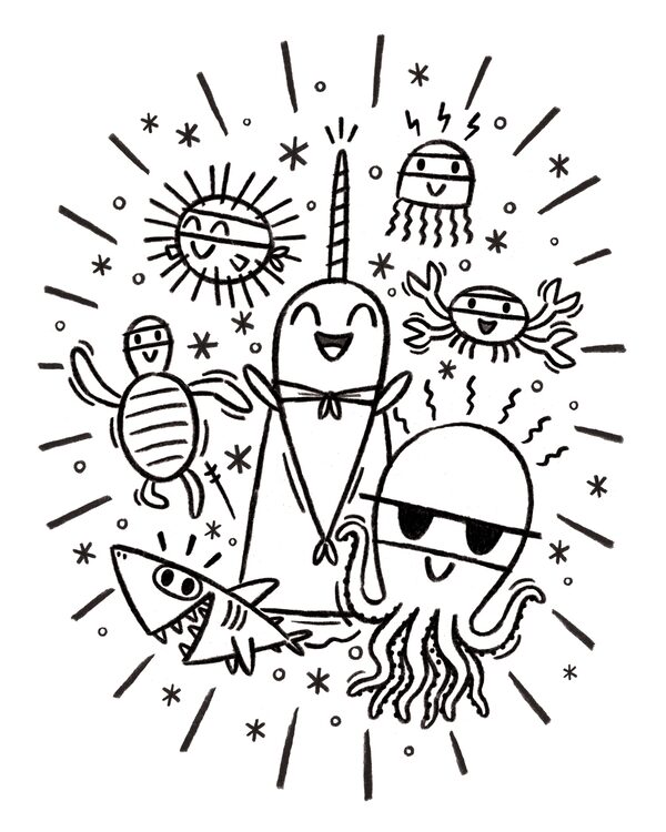Nature and the fascinating creatures in this world! Playing drawing games, too, and doodling. Carry around a sketchbook is my biggest suggestion. Inspiration can be found all sorts of places! Narwhal’s personality was inspired by ice cream and a photograph by Paul Nicklen, for instance.