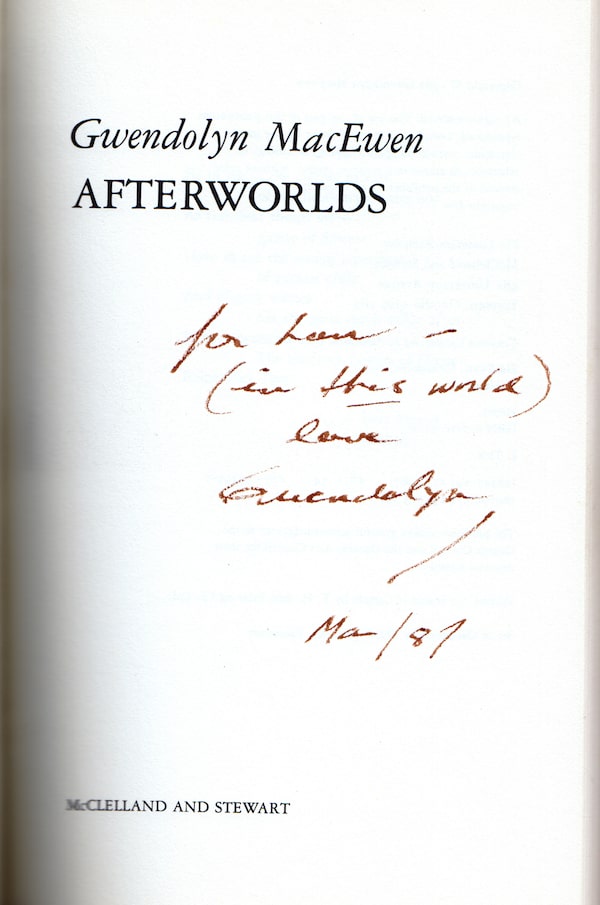 Gwendolyn MacEwen signed title page from book, Afterworlds.Supplied