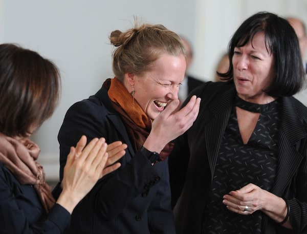 Author Kate Harris reacts after winning the $30,000 RBC Taylor Prize for her book Lands of Lost Borders: Out of Bounds on the Silk Road, in Toronto, Monday, March 4, 2019.The Canadian Press