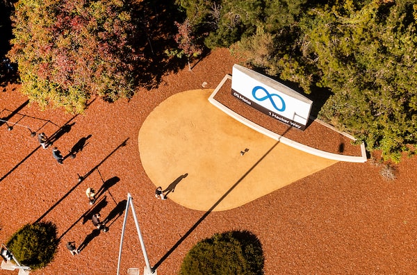 An aerial view shows a person passing a newly unveiled logo for "Meta," the new name for Facebook's parent company, outside Facebook headquarters in Menlo Park on October 28, 2021.NOAH BERGER/AFP/Getty Images
